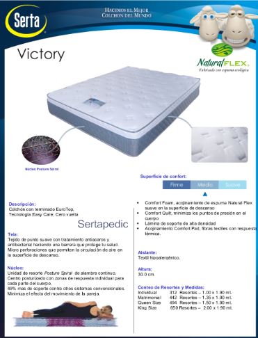 Serta made Vicotry mattress. Comes with the euro pillow top, Easy care mattress technology. This mattress is rated as a medium firmness which works well in Mexico on the stable wooden platform bed bases. This mattress has the Sertapedic comfort technology which enhances the comfort level of this mattress and comes with an economical price.