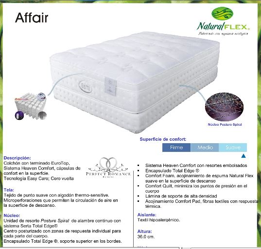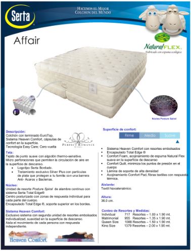 Higher end mattress made by Serta Affair. This incredible mattress has an independent spring coil system with each spring individually incased with its own sheeth. Mattress comes with a higer end spring count and is extremely comfortable. One of our best selling mattress and our customers get a lot of a mattress for the money as compared to other mattresses and spring counts of similar mattress.