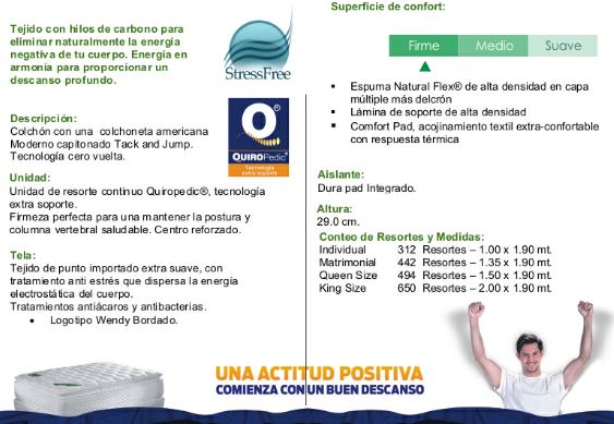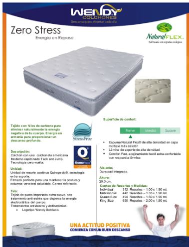 firm zero stress mattress. Comes with the quilted pillow top mattress. Great quality made by Serta. The wendy zero stress mattress made with different zones of back support and added comfort for a good nights sleep. Rated as a firm mattress. Layered with infiniflex maximum comfort pad which is hypo alergenic, natural flex foam to minimize pressure points on the body as it lays in rest. Only highest quality of foam density used and continuous springs which is unique to Serta. Individual mattresses sell for $595 , Full size sell for $695 Queen $795 and King $895 usd.