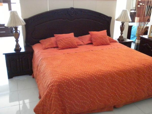 Atenas bedroom set. Seen here in a cherry finish. Set includes arched decorative headboard as shown here plus matching night stands, dresser, and mirror. Set has a total of 5 pieces and is a great price for those furnishing on a budget. Not included is the mattress or bed base. Inquire with our sales team for questions on this bed or others.