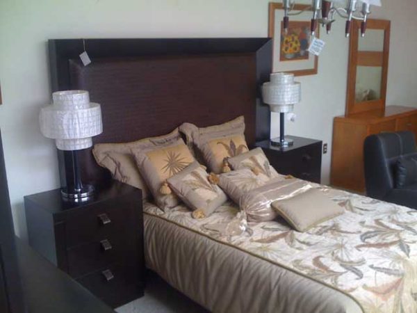 Elegant 5 piece bedroom set. Comes in a rich dark chocolate finish. Beautiful leather headboard with wood trim. Matching dresser and night stands with leather pull handles. Very high quality furniture. This bedroom set will add class and charm to your home or condo.