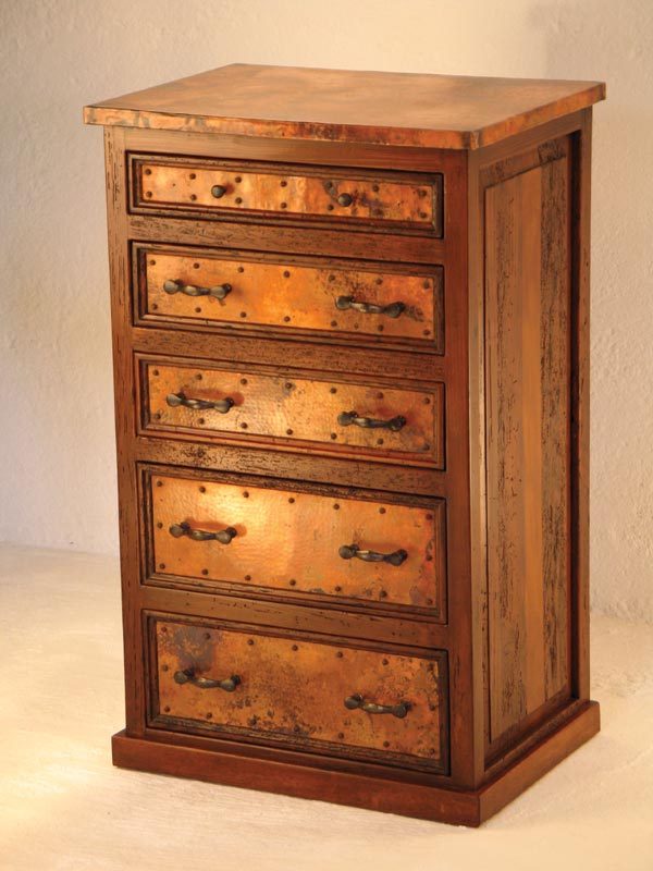 This old wood dresser with copper is exquisitely hand crafted with plenty of style. The rustic look is complete with the addition of the iron hardware. Mr-Vallarta.com copper line of bedroom furniture will add casual elegance to your decor.
