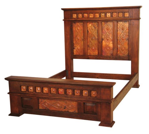 New Alma design copper and old wood paneled bedroom set comes complete with your choice of old reclaimed wood (or new wood distressed to look old) includes the beautiful head board in your choice of stain color finishes- shown here in default brown finish but also available in the normal other finishes (see samples above) foot board to match, side rails, and mattress supports. Clients with higher end or thicker mattresses may want to confirm head board height so you end up with the desired look and feel of this incredible bedroom set. May also want to consider the 3 drawer night stands or 1 drawer end tables to go with this set as it looks incredible. Prices are as follows: King size: $4,437, Queen: $3,995, Full: $3,495, Twin: $3,295. Please note that due to the wonderful nature of copper color variation is normal as the process it goes through when heated expanded and hammered into place the colors change from piece to piece. Each piece of copper is unique.