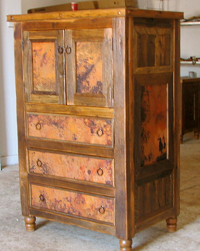 This rustic ranch console is exquisitely hand crafted with old wood and a hammered copper top. The rustic look is complete with the addition of rustic iron drawer pulls. Mr-Vallarta.com copper line of furniture will add casual elegance to your decor.