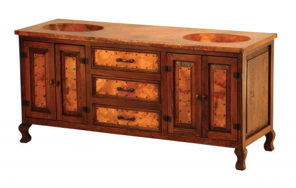 This extra-large sink cabinet features two elegant copper sinks for him and her. Be sure to click the Copper Detail image above for a close-up sink example. The hand-hammered copper sinks are seamlessly integrated in this stunning three-drawer sink vanity, which features reclaimed wood, elegant carved corner legs, and copper panel accents. The interior cabinets are empty for the sinks and the faucet holes are not pre-drilled. Available below either as a copper top cabinet, with integrated copper sinks as pictured, or with stylish above-counter copper sinks.