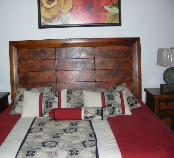 square headboard with copper inlaid squares surrounded by a copper boarder.