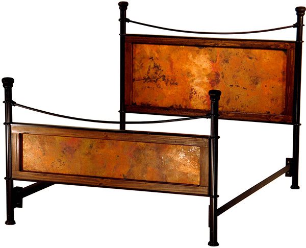 This Copper Collection iron bed features two extra-large hammered copper panels on the head- and footboards, which are framed by reclaimed wood. The elegant iron supports also feature iron rope accents. Be sure to select other Copper Collection pieces for your bedroom set!
