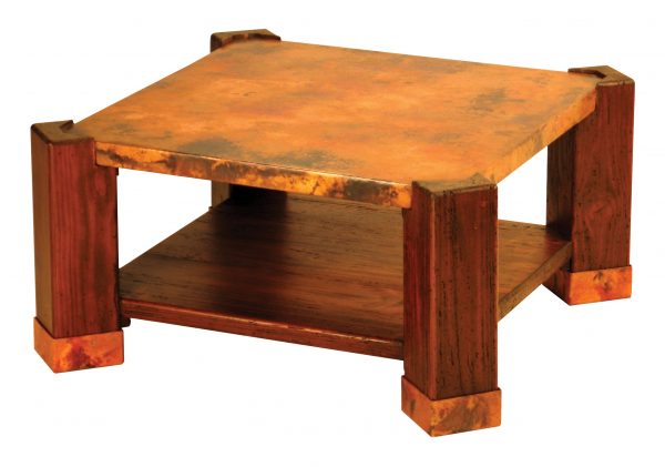 The Phoenix coffee table combines modern lines with rustic appeal and features a beautiful hand-hammered copper top cradled by wooden legs. The distressed wood and fired copper are a natural match for each other. The coffee table includes a spacious bottom shelf and will become the focal point of any living room.