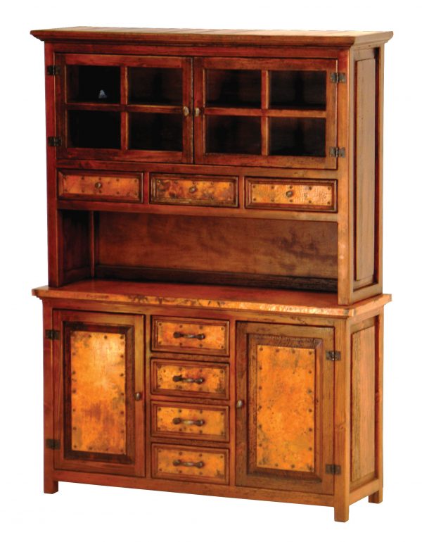 The Copper Collection Francisco four-door cupboard is a beautiful and elegant storage solution for your home. Use it in a dining room or kitchen area to store everything from china to silverware and table accessories. The hutch features two glass cabinet doors and three spacious drawers. The buffet features a hammered-copper top, two large cabinets with copper panels, and four center drawers.