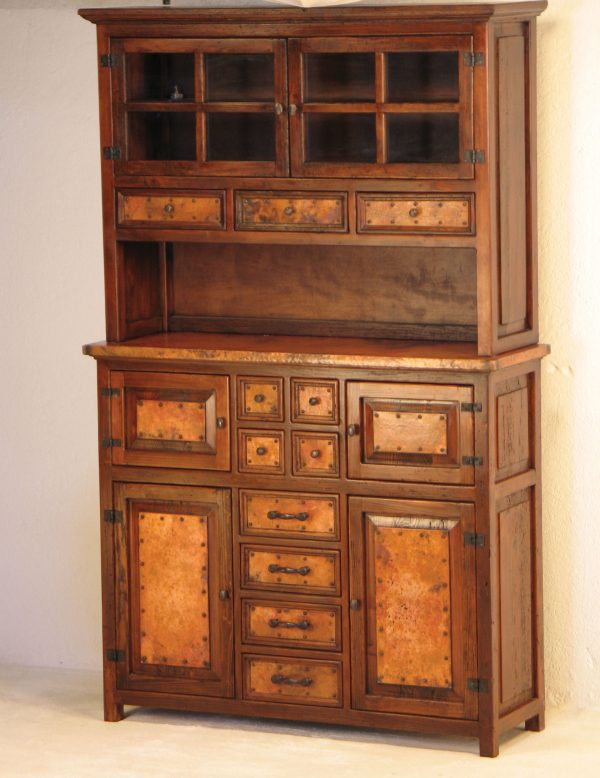 The Copper Collection Francisco six-door cupboard is an elegant extra-tall storage solution for your home. Use it in a dining room or kitchen area to store everything from china to silverware and table accessories. The hutch features two glass cabinet doors and three spacious drawers. The credenza features a hammered-copper top, two large and two small cabinets with copper panels, four center drawers, and four smaller pull drawers.