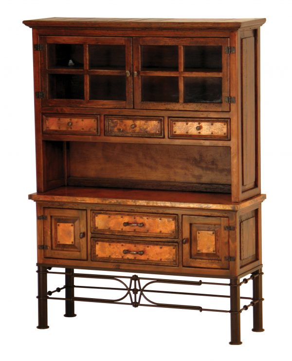 The Copper Collection Francisco console and hutch create an elegant serving and storage area in your dining room or kitchen. Use the hammered copper top as an additional preparation or serving area and the cabinets and drawers will store everything from china to silverware and table accessories. The hutch features two glass cabinet doors and three spacious drawers. The console features two large cabinets with copper panels and two large center drawers