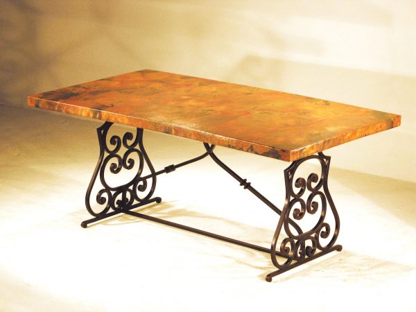 The striking Monte Cristo Dining Table features an enormous copper surface area that is hand-hammered fine enough to easily be written on problem free. The beautiful base features elaborate iron scroll work on either side. You’ll appreciate the time and labor put into this Southwest table for years to come. Available in multiple diameters below for any size dining room. Be sure to pick up Copper Collection dining chairs as well to complete your Southwest décor.