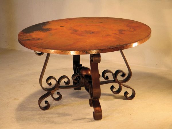 Unique and full of Southwest appeal the Patricia dining table features thick forged iron supports and a vibrantly colored copper table top. The heavy base is elegantly formed to curl and converge in the center with a ball of iron and supports the large hammered copper top in sizes of up to seventy-two inches. This stunning dining table will become the centerpiece of your dining room collection!