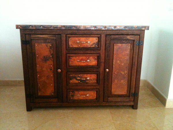 The 4 drawer 2 door console dresser features the beautiful combination of distressed wood and fired copper in a classic dresser configuration. Four spacious drawers will keep all of your clothes and accessories secure, two doors with added shelving for extra space and with extra room on the copper top for accessories. Perfect for a rustic or southwestern bedroom décor!