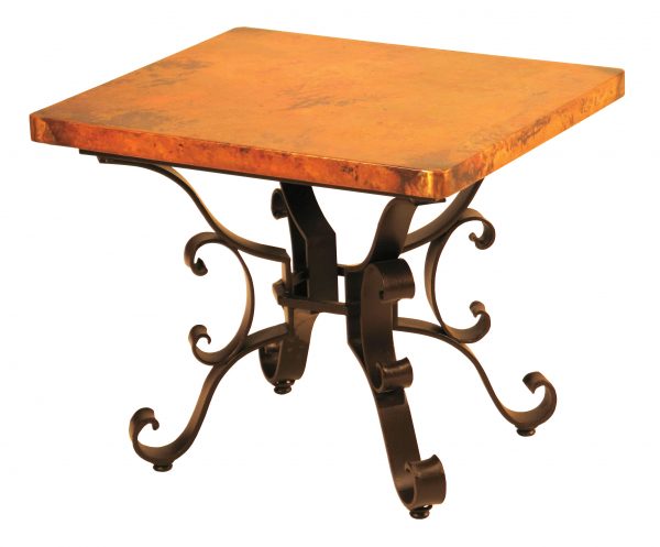 The Roman end table features heavy scroll work that elegantly supports the fired copper top with bright colors.
