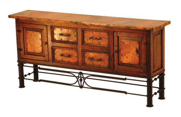 The Pablo console table incorporates distressed wood, a colorful copper top and panels, and an elegant iron stand to create a stunning Southwest piece. This console will highlight any room of your home and provides functional storage space with four spacious center drawers and extra-large side cabinets.