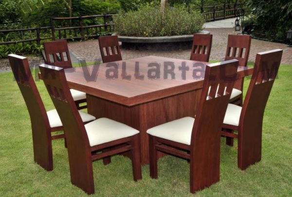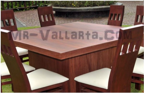 Elegant 8 person dining table made of primavera wood. Custom design for the distinguished tastes. This elegant table will impress and provide ample room for large gatherings. Table was constructed of primavera wood which a species with a light wood color and termite free. Set comes with the table pedestal style base and 8 sturdy chairs as pictured. Chairs are interchangeable. Different style chairs are available to go with this set and can be purchased separately. Prices may vary if different style chairs are selected.