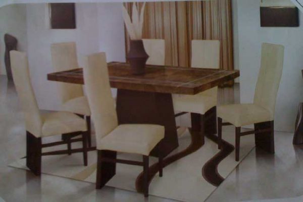 123Elegant six person dining table comes with a marble top, solid base in chocolate finish. Comes as a set with six chairs covered in leather as pictured.