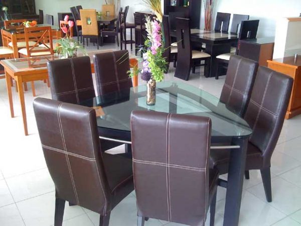 Very nice looking glass table includes 6 leather chairs. Plenty of room for 6 people, would fit in smaller spaces or dining rooms. Stylish and modern looking easy to clean. Includes all chairs pictured. Great pricing. See this table and others at Mr-Vallarta.com- We offer special pricing on package deals. Let us furnish your home for less and save on brand new furnishings.