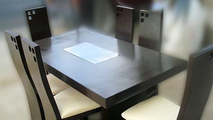 123Very nice chocolate finish 6 person dining table comes in chocolate finish or maple finish. Stylish high backed chairs with padded seats. Price includes 6 chairs to match table.