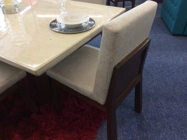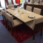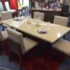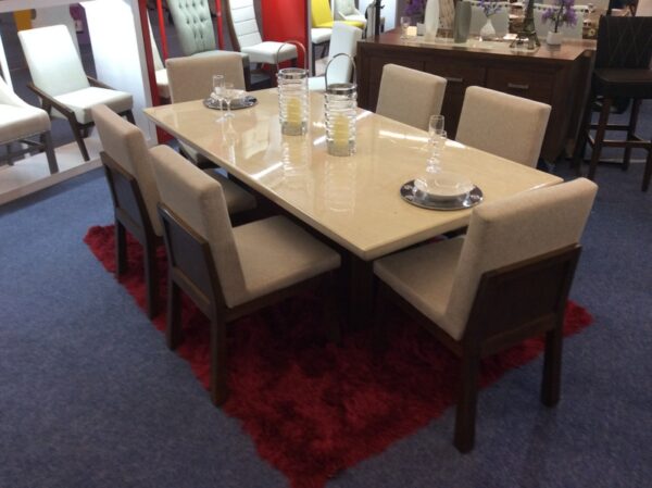 High quality and pride in workmanship is shown in this beautiful modern marble table. Seats up to 6 people with a rectangular shape. Two on each long side with the end chairs on both ends rounds the seating to 6 people comfortable. Table measures 3 feet by 6 feet approximately. Like this table order now by placing in your cart and checking out. Email us at mrvallartasales@gmail.com for more questions about this table or others. Includes chairs shown. Chair styles can be updated, changed or exchanged for other styles. There may be a price change depending on what style of chairs you would prefer.