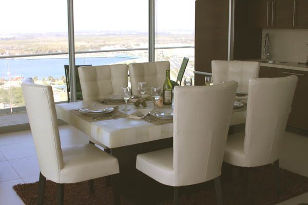 Beautiful onyx dining table as shown made for 6 people. Sold in 4, 6 and 8 person sized table. This table will add class and elegance to your home. Chairs sold separately many different styles of chairs to choose from. Chairs shown are called russia in cream. Six person table measures approximately 60 inches x 39 inches.