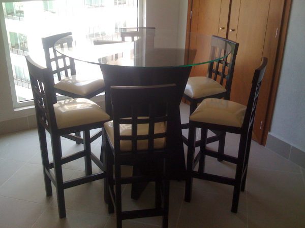Very nice and clean counter height dining table. Comes with 6 chairs as shown. Also, available in maple or avellana (hazelnut) Sturdy and solid table, chairs are well made and are comfortable to sit on with wide seats and soft leather.