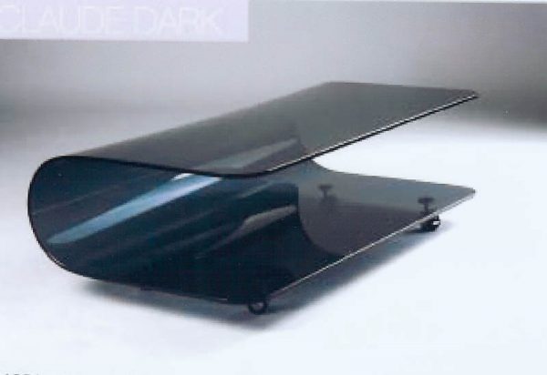 Great looking very unique curved coffee table in dark tinted tempored glass. Coffee table comes with 4 steel castors on the bottom to move easily. Gives the table a slight industrial look. Great conversational piece for your home. Measures 51L X 27.6W X 16.5