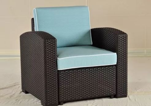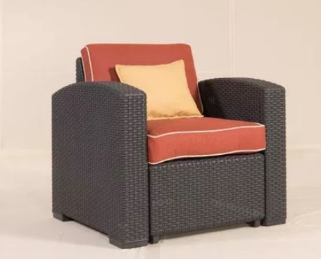 Rattan sitting chair made for exterior use on the beach, balcony, terrazo or anywhere you need outside furniture. These chairs are very stylish and well made come with nicer cushions than what is normally sold with other types of rattan furniture. Chairs can be purchased in singles or as a set of two. Chairs can be placed in pairs around the deck or balcony with a rattan table that goes between the chairs. Great for relaxing with cold beverages or for all other needs. Ottoman is also available with this chair and sold at a separate price. Inquire for more details if the ottoman is needed.
