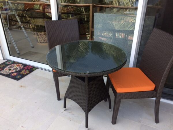 Great little round rattan table. Measures approximately 31 inches in diameter. Big enough for 2-3 persons. This table is great for a smaller terrace or anywhere a smaller table is needed. Could also be used indoors in a kitchen or bedroom. Please note chairs are sold separately and can be included with arms or with out arm rests. The seat cushions are sold separately as well. Chairs with out arms sell for $195 and chairs with arm rests sell for $225 cushions sell for $40 each.