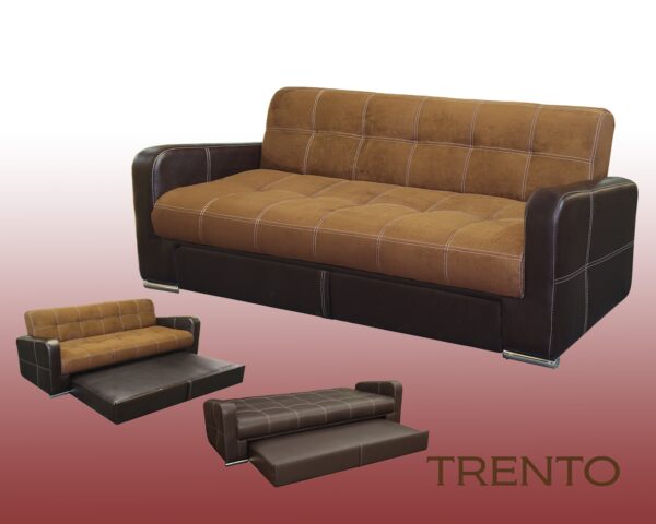 Sofa bed with TRENTO Mr. Vallarta.com. Very nice three position sofa bed made to sleep 2 to 4 adults or kids. Converts from love set to full size bed when back rest is easily laid down into a flat position. Also, comes with a pull out trundle bed from underneath the sofa which slides out easily on wheels to sleep to additional people. Very soft and comfortable suede fabric that is easy to clean. Available in chocolate suede as shown. Measures 7ft 4 inches in length X 35 inches wide. When sofa is laid down in the bed position it is a regular full size bed which is 52 inches in width. Also trundle comes with its own mattress which is approximately the size of an individual bed mattress.
