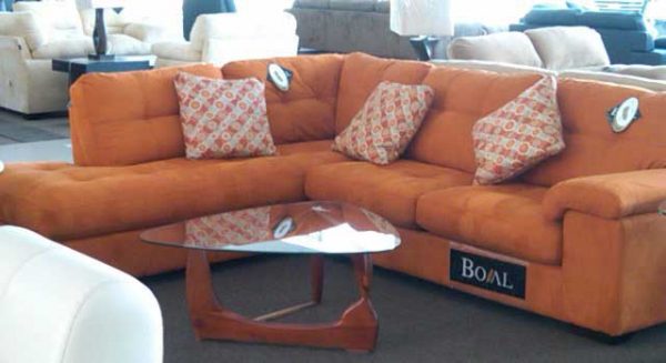 Carrot colored sectional sofa. Soft and cozy will fit nicely in your condo or home. Very economically priced to sell fast. Made by Boval will last for years easy to care and clean. Available in fabric, suede or leather.
